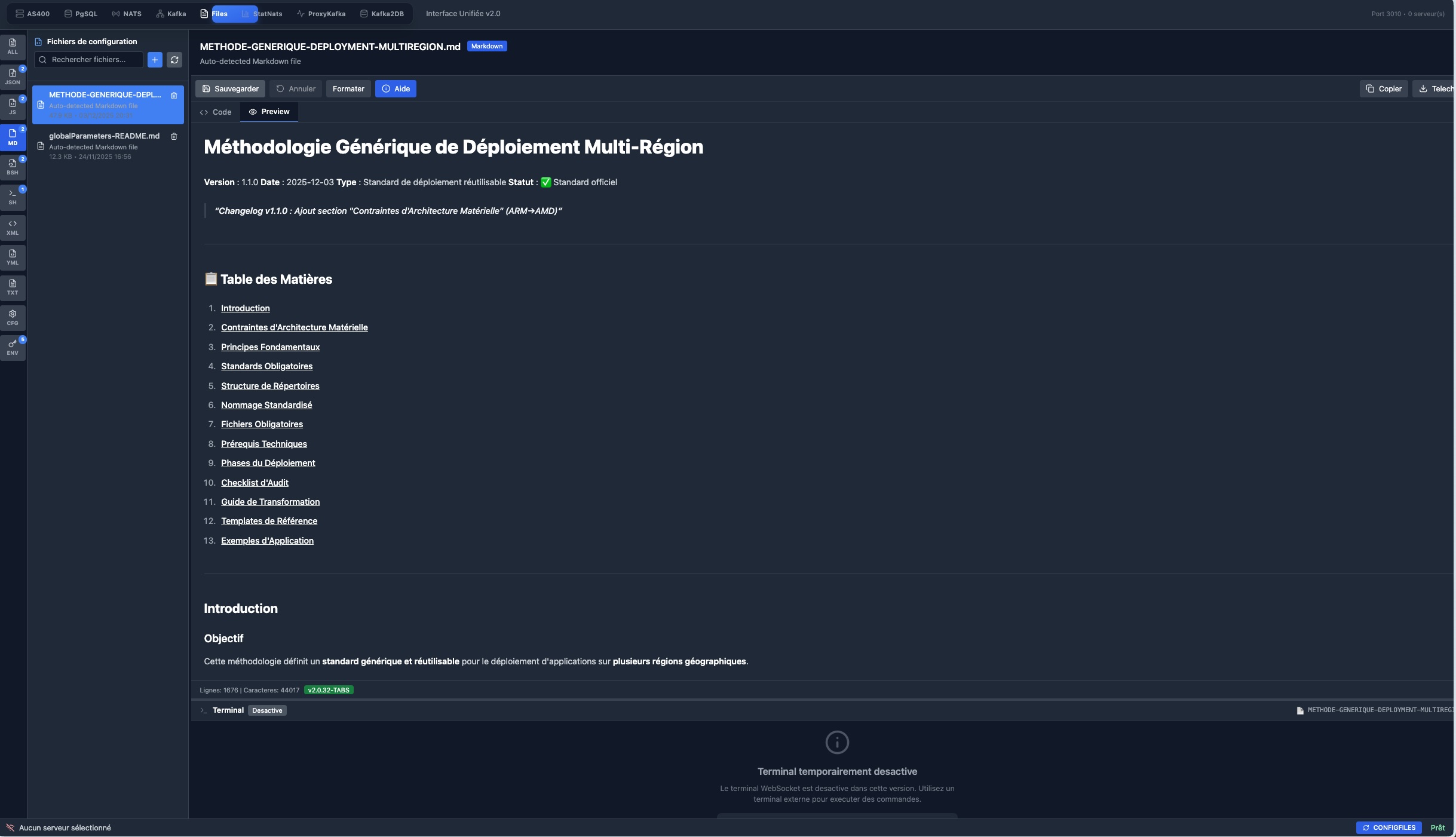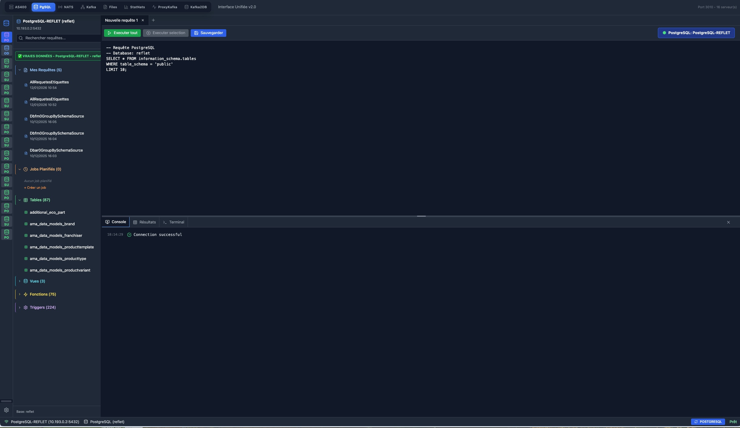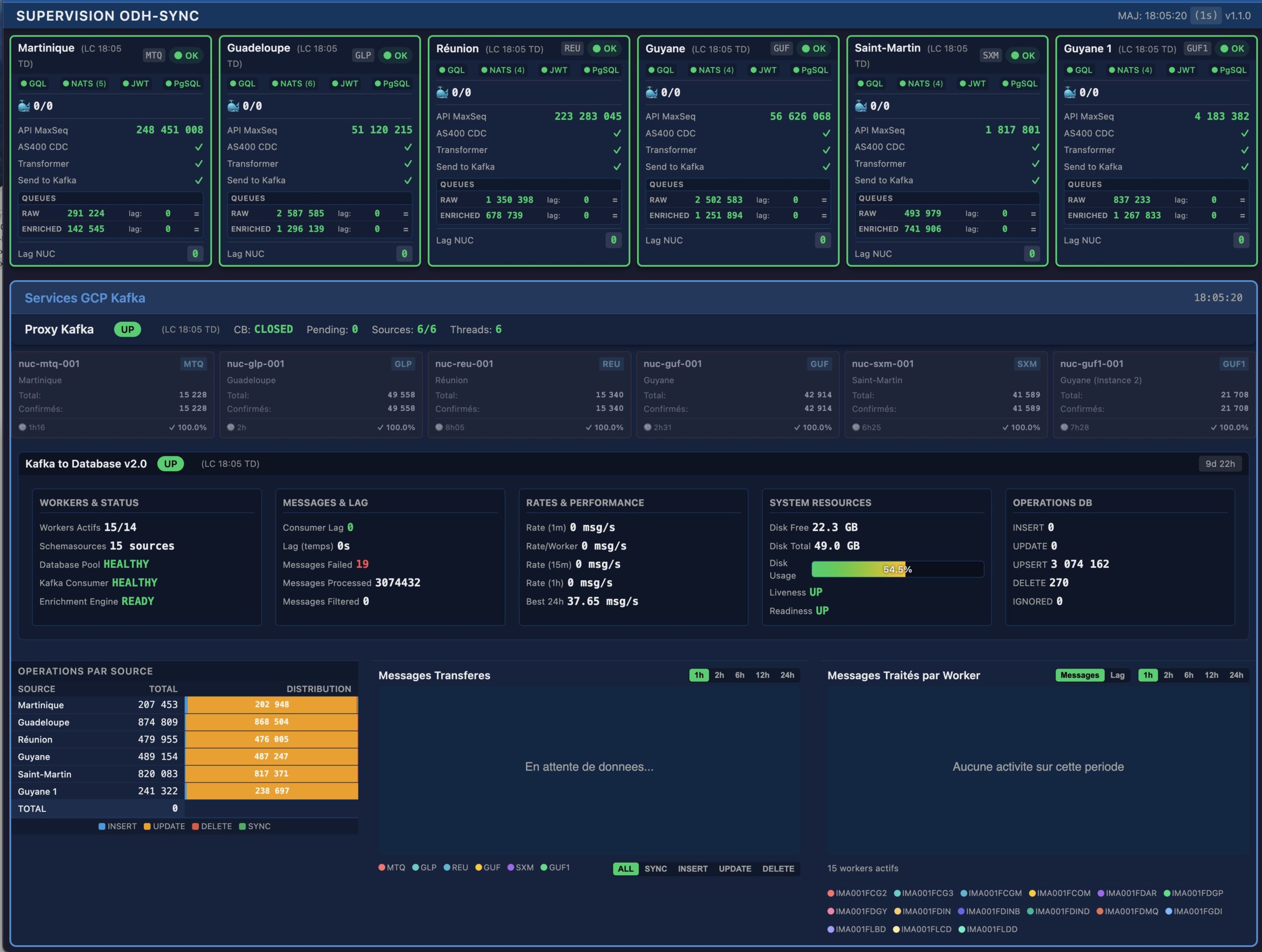 de bord centralise l’état de 40+ composants critiques : AS400 CDC, transformateurs de données, flux Kafka, bases PostgreSQL et services NATS.