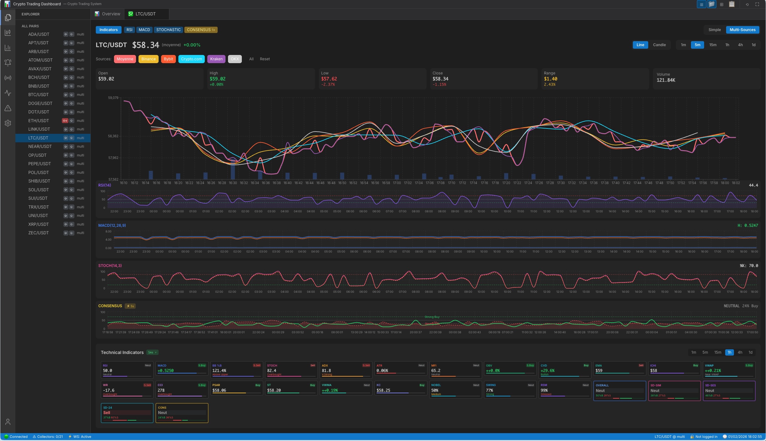 Bybit, OKX, Kraken et Crypto.com) et exécute automatiquement des ordres virtuels basés sur des signaux techniques avancés.