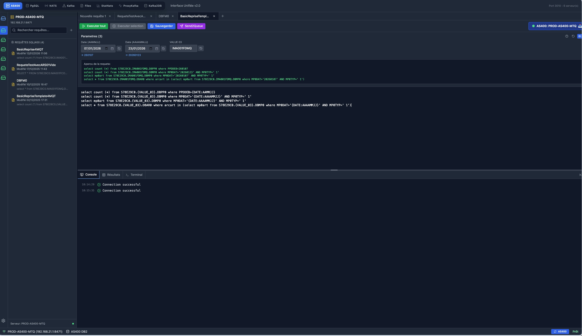 Métriques détaillées : séquences AS400, messages traités, workers actifs