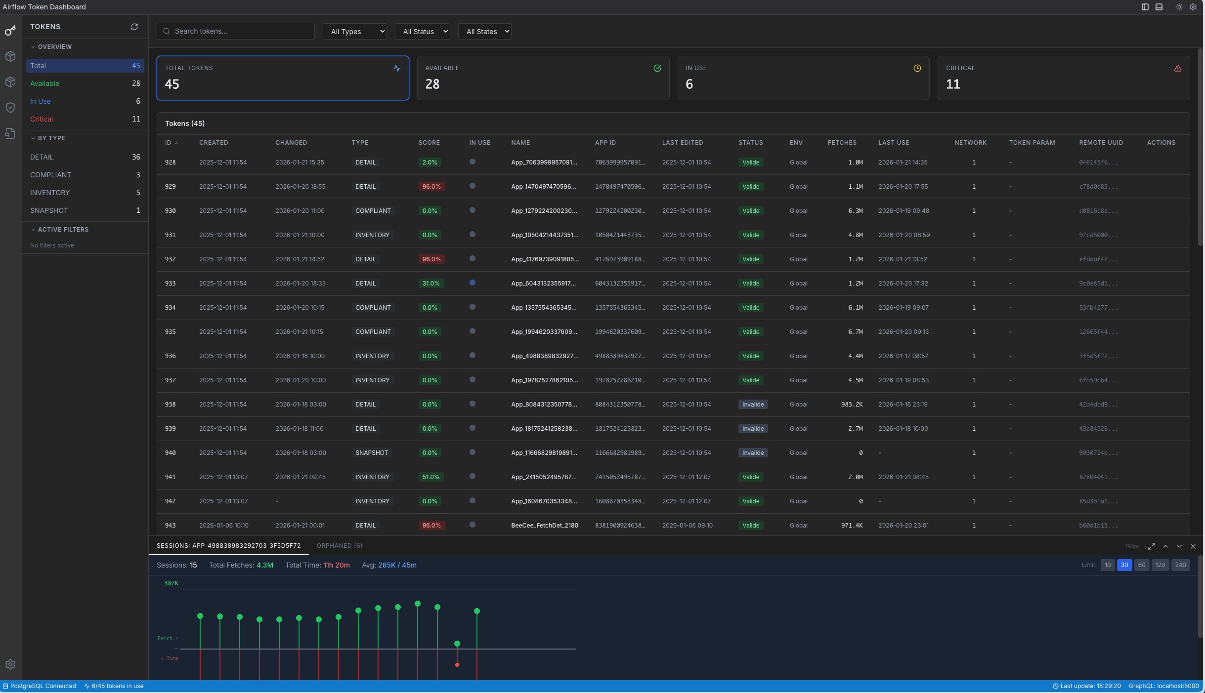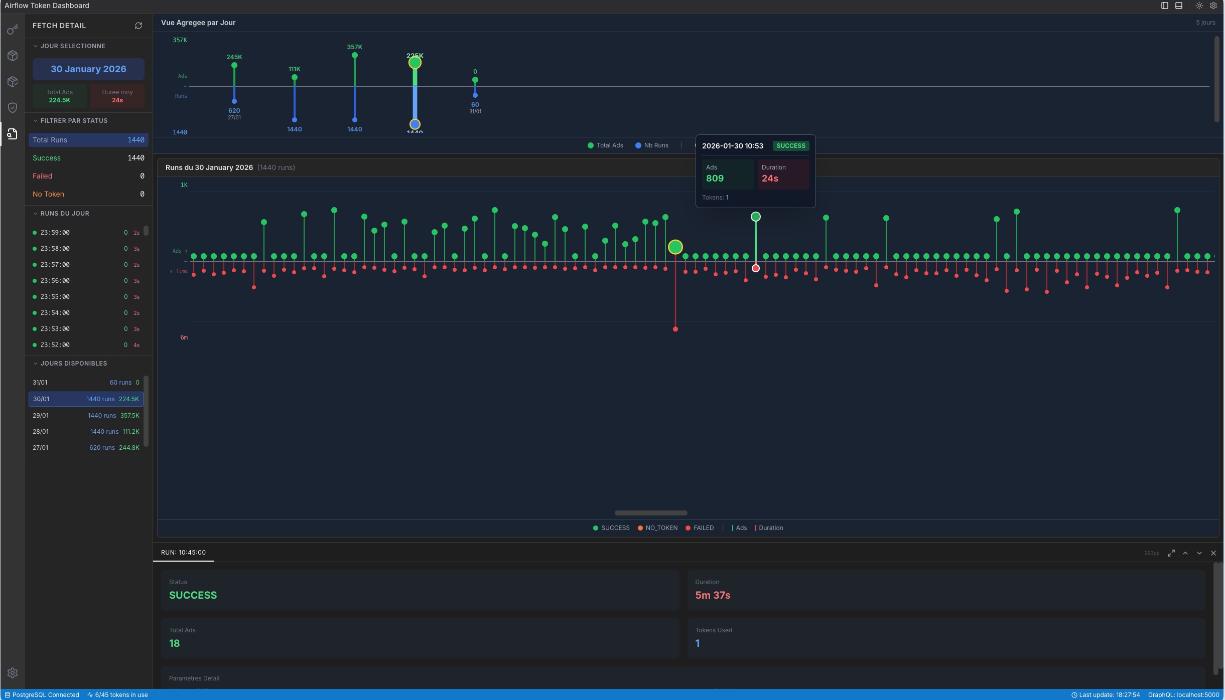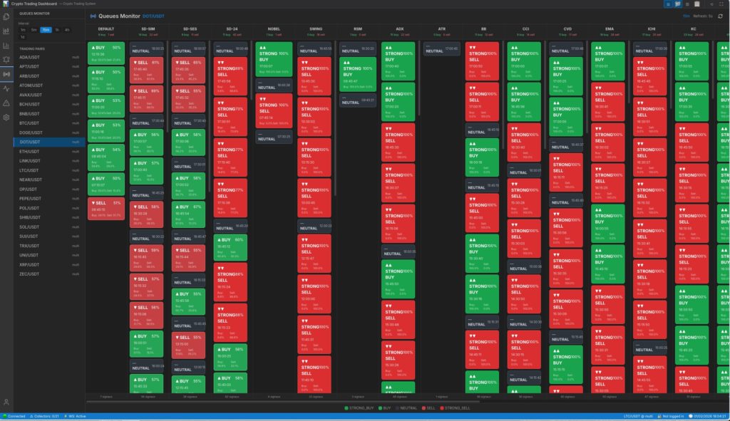 Le tableau de bord temps réel offre une visibilité instantanée sur l’ensemble des positions, les gains réalisés et latents, ainsi qu’un historique complet des transactions. Conçu pour la robustesse avec une architecture supervisée et une persistance PostgreSQL/TimescaleDB,
